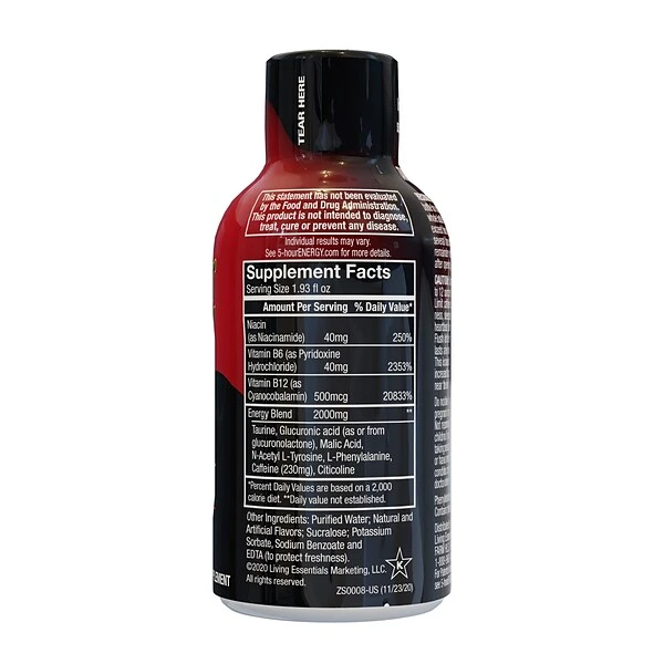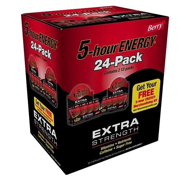 Need an extra boost to get through your day? Grab a Berry Flavor Extra Strength 5-hour ENERGY® shot. It’s packed with a big energy blend and big taste. The only thing small about it is its size. So, why sip yet another coffee when you can have a Berry Flavor Extra Strength 5-hour ENERGY® shot and get hours of energy? Berry Flavor Extra Strength 5-hour ENERGY® shots are packed with a blend of essential B-vitamins and amino acids, but no sugar or herbal stimulants.