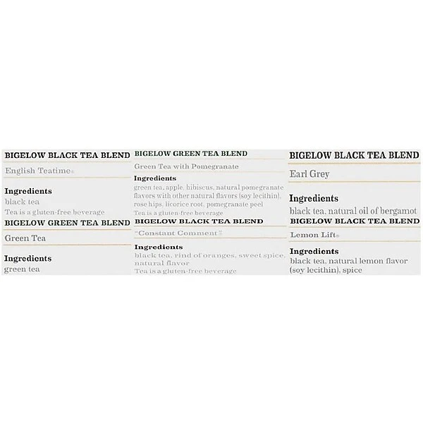 Bigelow® Assorted flavor tea is a regular caffeinated beverage that is wrapped individually in tea bags to maintain freshness. Tea gives senses of calmness and delivers healthy antioxidants. Flavors include: Green Tea Classic, Earl Grey, English Teatime, Lemon Lift, Green Tea Pomegranate, Constant Comment. (168 Bags per Case, 28 Bags per Box)
