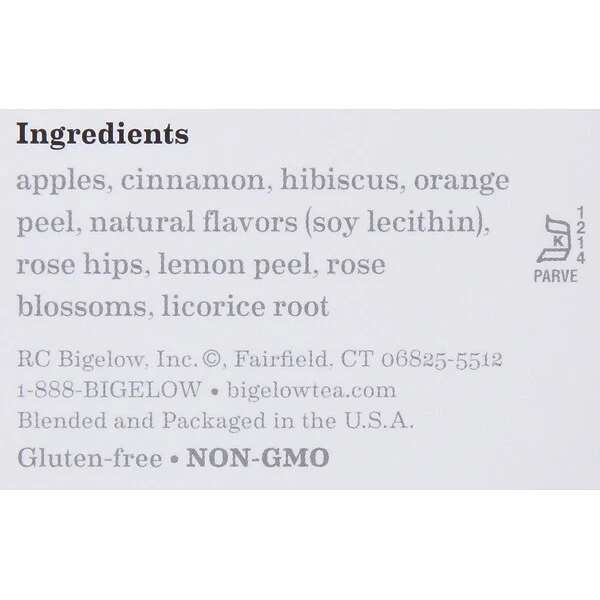 - Ingredients: apples, cinnamon, hibiscus, orange peel, natural flavors (soy lecithin), rose hips, lemon peel, rose blossoms, licorice root