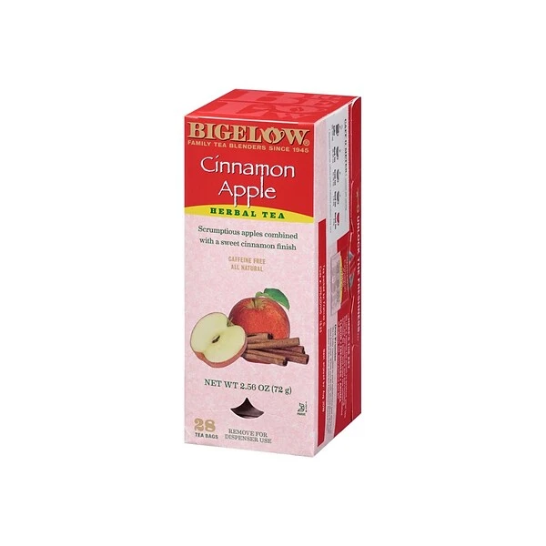 Bigelow® Cinnamon Apple brings the taste and aroma of a fresh baked apple pie to your beverage service with this Bigelow cinnamon apple herb tea, and your customers won’t be able to resist! It brings you perfect balance of warm, sweet and spicy flavors. Though this tea is naturally caffeine-free, it is made from an invigorating blend of apples, cinnamon, hibiscus, orange peel, rose hips, lemon peel, rose blossoms, and licorice root. When brewed, it develops an eye-catching candy apple red color and an aroma of sweet spices. Allow your guests to relax and unwind with a cup of this crisp and slightly tart cinnamon apple flavored tea that’s great for any occasion!