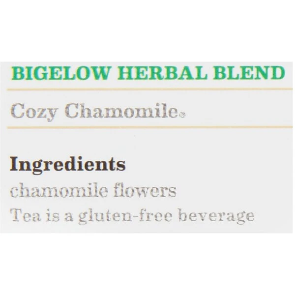 Bigelow® Cozy Chamomile tea is the perfect cup for relaxing before sleepytime or after a stressful day at work. Its floral notes & sweet flavor will soothe your taste buds & relax your body. Individual fresh pack. A relaxing herb tea so delicate and soothing. No caffeine. All natural. Individual fresh-pack locks in flavor. For three generations the Bigelow family has specialized in creating a variety of deliciously different teas and herb teas. Our individually overwrapped tea bags ensure that the last cup of tea you have from this box is just as delicious as the first. Each tea bag is individually sealed in a foil packet. Blended and packaged in the U.S.A.