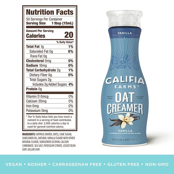 Stir some bliss into your day with this sweet and velvety smooth oat creamer. The seductive flavor of vanilla and the sweet creamy goodness of oat milk blends beautifully into your coffeenboth hot and iced for a daily dose of decadence with every cup. Made with simple plant-based ingredients, Vanilla Oat Creamer is pure dairy-free indulgence without the guilt. Its a coffee creamer that loves you back.