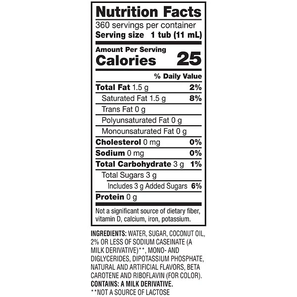 - Water, coconut oil, sugar, sodium caseinate (a milk derivative)**, dipotassium phosphate, mono- and diglycerides, artificial flavor, beta-carotene color. Contains: a milk derivative. CONTAINS: A MILK DERIVATIVE.