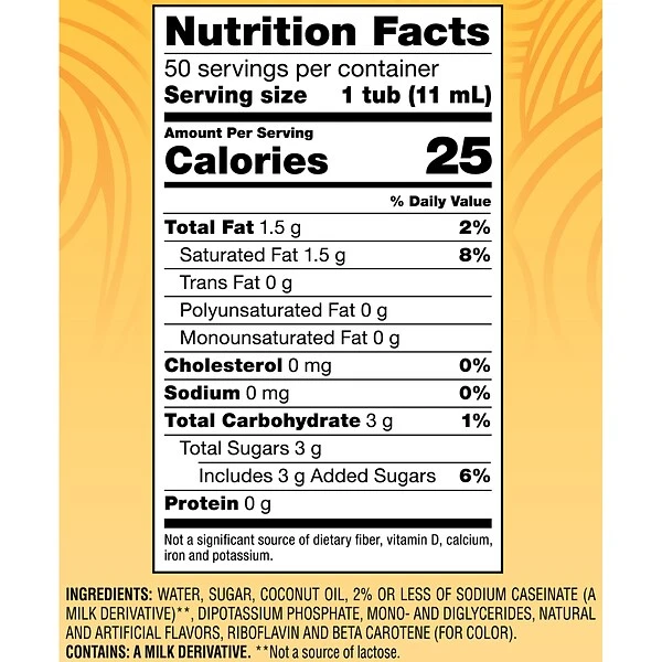 - Ingredients: water, sugar, coconut oil, sodium caseinate, dipotassium phosphate, mono- and diglycerides, natural and artificial flavors, and artificial colors