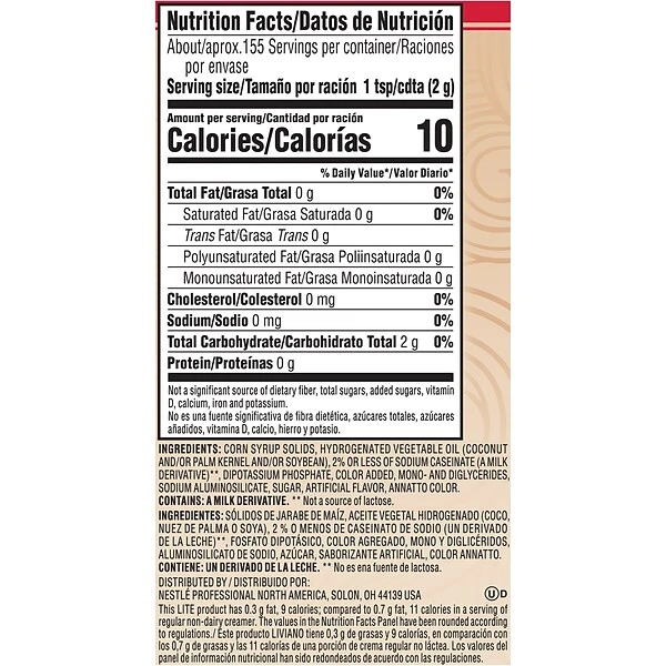 Enjoy creamy coffee with less guilt with this Lite powdered creamer. It contains 50 percent less fat than the original variety for fewer calories, and it’s lactose-free, gluten-free and certified kosher to meet restricted dietary requirements. This 11-ounce canister of Coffee-mate powdered creamer has a flip-top lid for easy, controlled pouring.