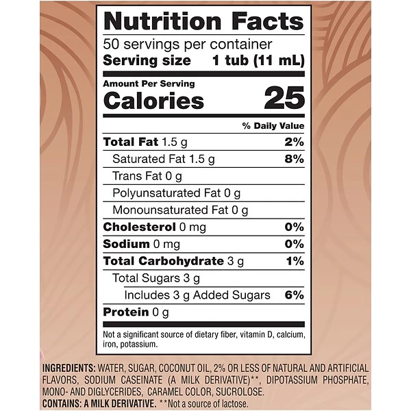 - Ingredients: water, sugar, coconut oil, natural and artificial flavors, sodium caseinate (a milk derivative), mono- and diglycerides, dipotassium phosphate, caramel color, sucralose