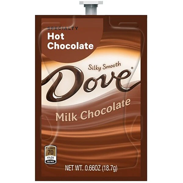 Satisfy your craving for hot chocolate with this silky smooth milk chocolate drink. The premium cocoa and milk create a tasty flavor for guests, while the 72-count package makes it simple to stay fully stocked. This Dove hot chocolate drink is compatible with FLAVIA® brewers, making it a good choice for break rooms and office kitchens.