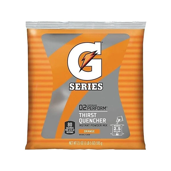 Keep a generous supply of replenishing carbohydrates and electrolytes on hand with this carton of energy drink powder. The orange-flavored mix comes in 32 bags that yield up to 2.5 gallons each of drink for convenience and multiple servings, which is perfect for teams and other groups. This Gatorade energy drink has been formulated to help speed fluid absorption, regulate blood sugar levels and replace electrolytes lost in strenuous activity.