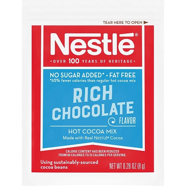 Nestlé Hot Cocoa, No Sugar Added, Fat Free Rich Chocolate Flavor is a rich-tasting, no sugar added and fat free hot cocoa mix that creates a rich and indulgent chocolate flavor. Made with real Nestlé cocoa using sustainably-sourced cocoa beans, our hot chocolate is part of the Nestlé Cocoa Plan to promote better farming, better lives and better cocoa. Just add hot water or milk and treat yourself to a delicious, 99.9% caffeine-free cup of cocoa. Single serve hot cocoa packets are perfect for offices, cafeterias, restaurants and more. Kosher Dairy.