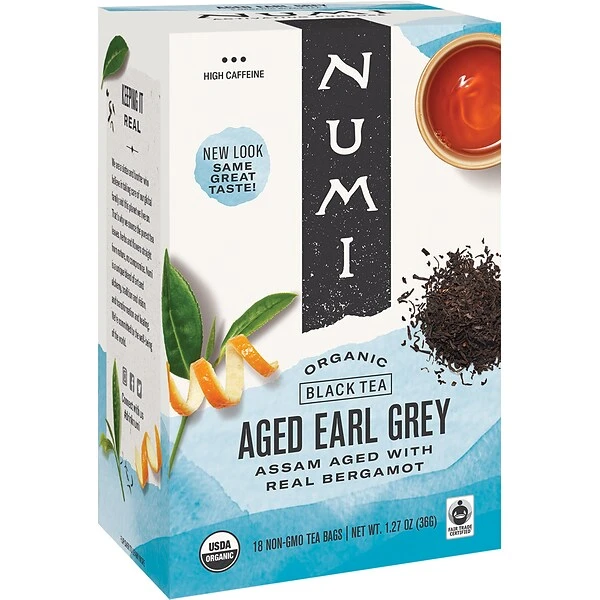 Steep a cup of Assam black tea with a hint of bergamot for yourself or a friend with this box of 18 tea bags. A pop-open bottom panel on the box simplifies dispensing, and the individually packaged tea bags retain freshness until you’re ready to prepare a cup. This Numi Earl Grey tea contains no added flavorings for a fresh, pure taste.