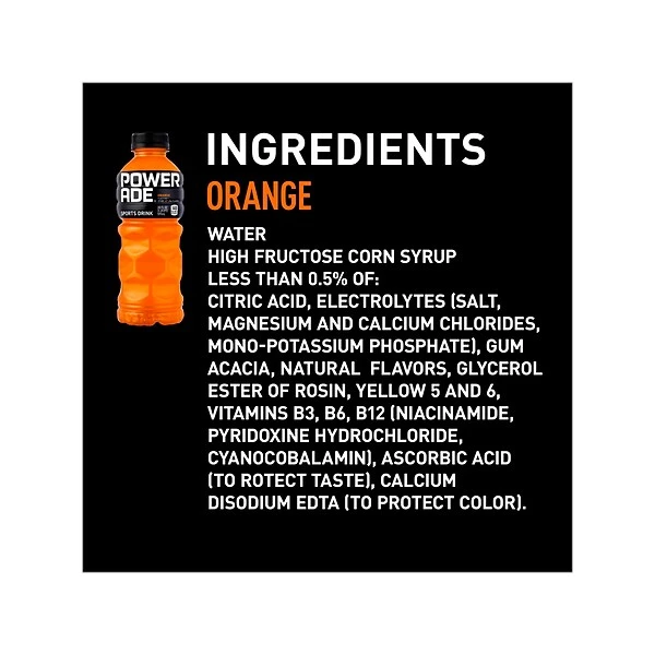 - Ingredients: water, high-fructose corn syrup; less than 0.5% of: citric acid, gum acacia, natural flavors, glycerol ester of rosin, electrolytes (salt, magnesium, and calcium chlorides, monopotassium phosphate), vitamins B3, B6, B12 (niacinamide, pyridoxine hydrochloride, cyanocobalamin), Yellow 5 and 6, ascorbic acid (to protect taste), calcium disodium EDTA (to protect color)