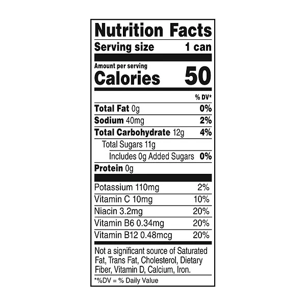 - It’s rich in B vitamins, contains no artificial colors or flavors, and provides a combined serving of vegetables and fruit in each can